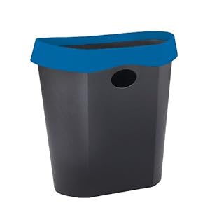 - Stylish oval bin with an 18 litre capacity. The flat back of this bin will neatly against flat surfaces to keep your office tidy. The colourful removable rim allows liners to be discreetly hidden and neatly secured. Features a hand-hold for ease of emptying. Capacity: 18 litres. WxDxH: 350x245x350mm. Blue and Grey.
